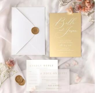 Whether you're planning a glamorous black-tie affair, a rustic outdoor celebration, or a whimsical garden party, your Gold Mirror Acrylic Wedding Invitation Cards can be customized to suit your wedding theme and style. Incorporate design elements such as vintage lace, rustic woodgrain, or tropical foliage to evoke the ambiance of your chosen venue and create a cohesive look and feel throughout your wedding stationery suite.